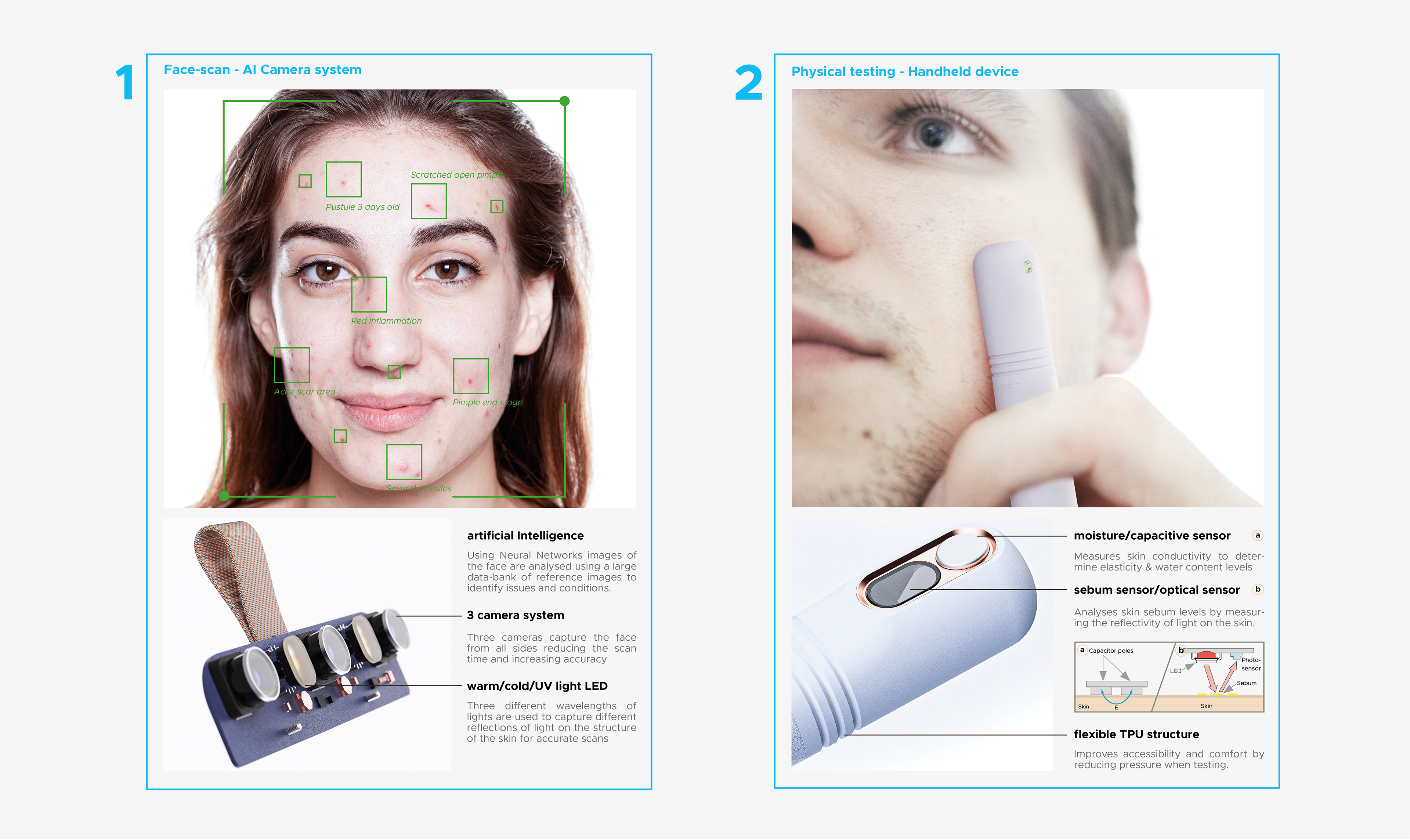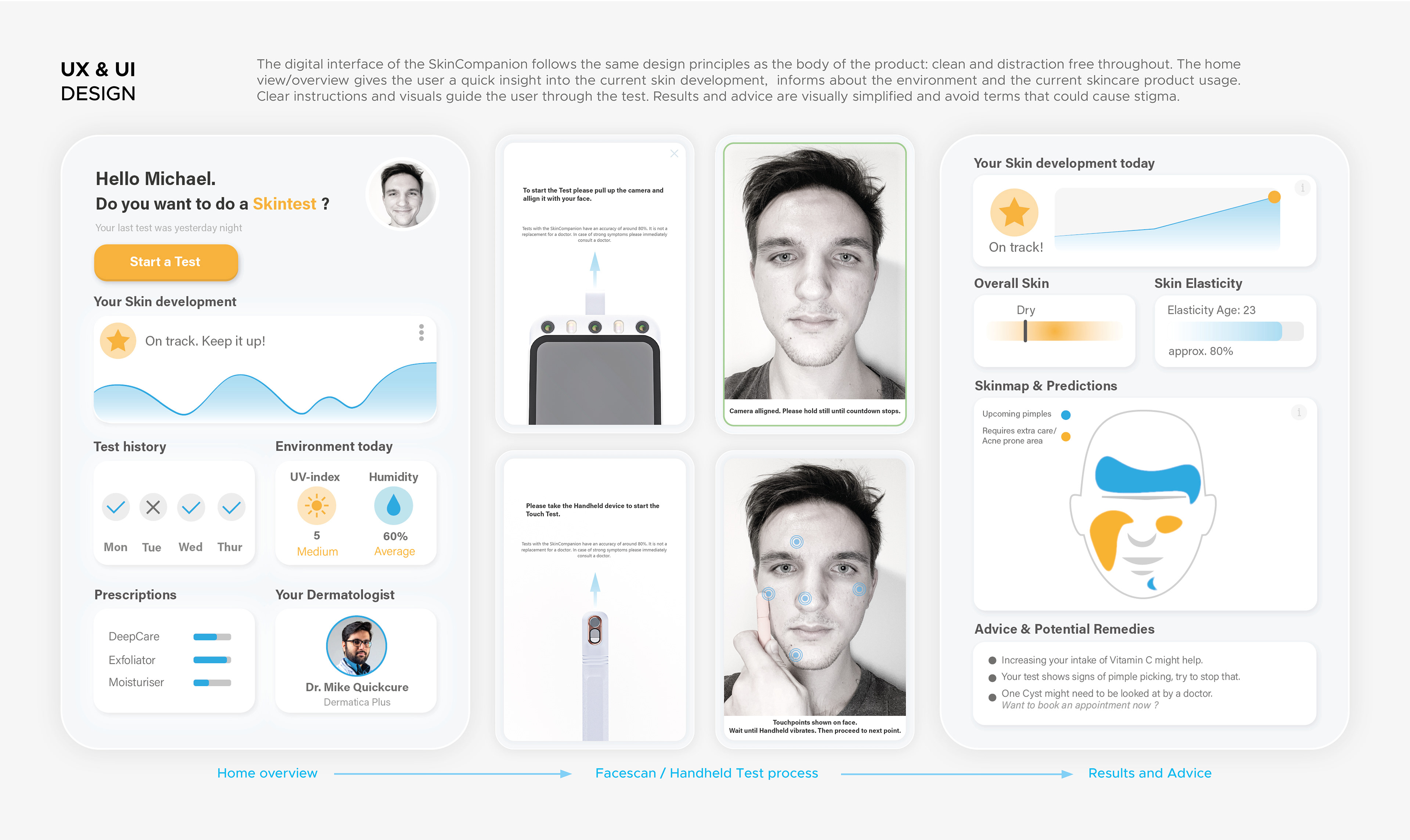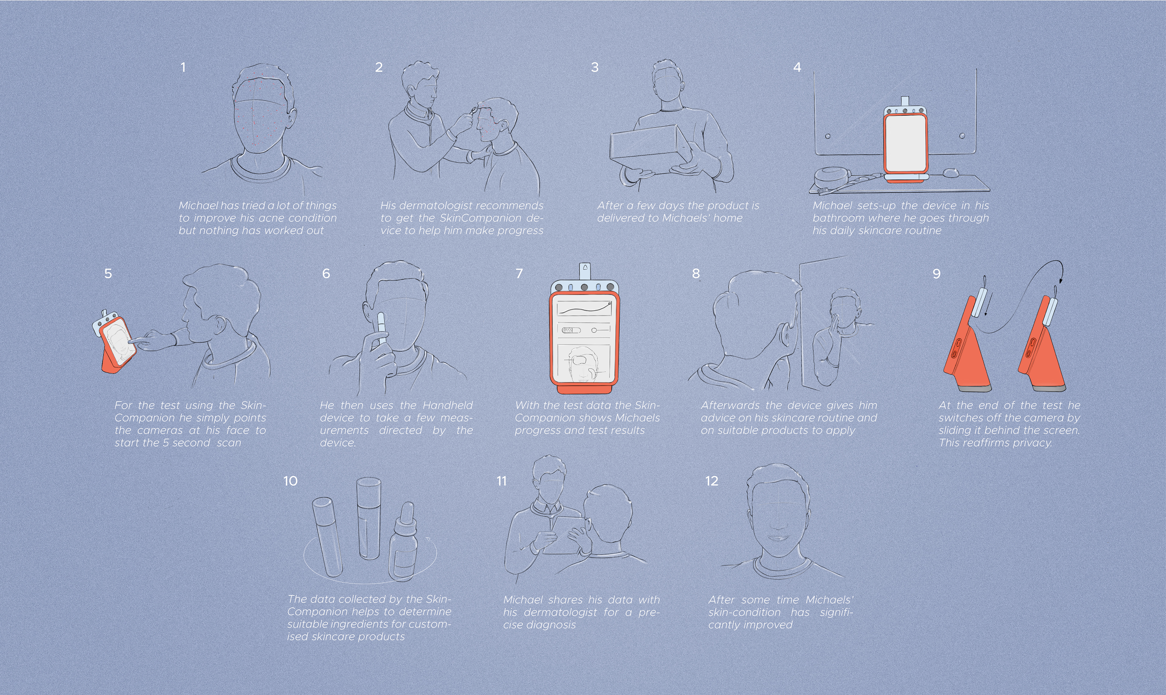 SkinCompanion is an AI-powered Skincare assistant which uses cameras and physical sensors to gather data about the users skin. The data is analyzed to provide skincare advice, formulate custom skincare products and to improve skincare-routines.